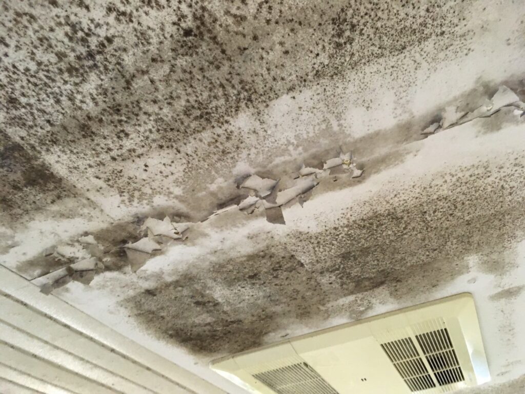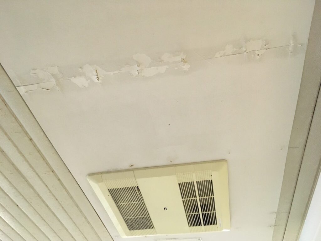 お風呂場は特に湿気がこもりやすい場所のため、天井全体に黒カビが広範囲に発生しており、換気扇周辺を中心に塗膜の剥がれも見受けられました。